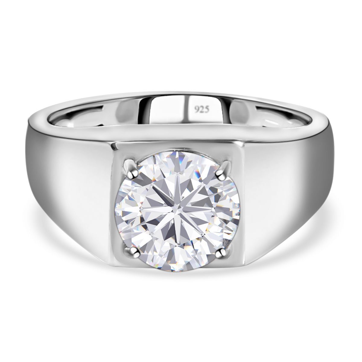 Round Cut 2 Carat Tw Solitaire With Side Accent Mens Moissanite Rings In Sterling Silver